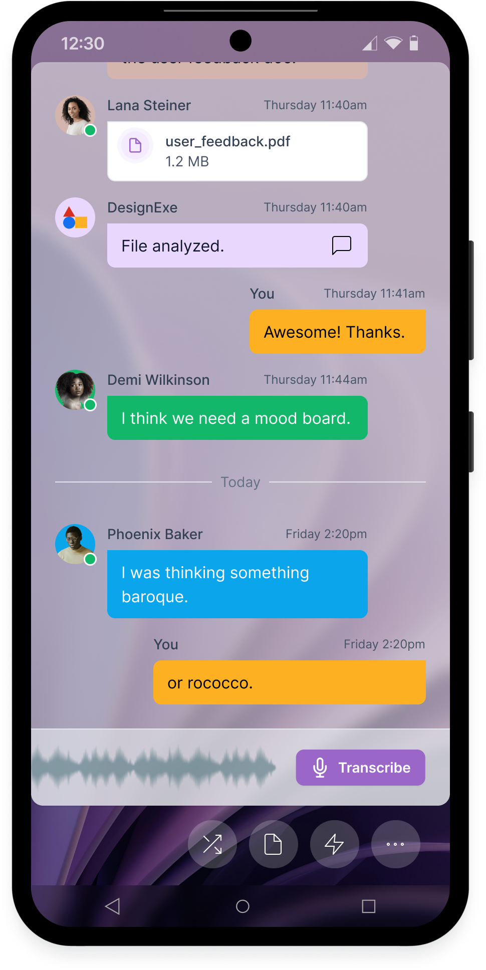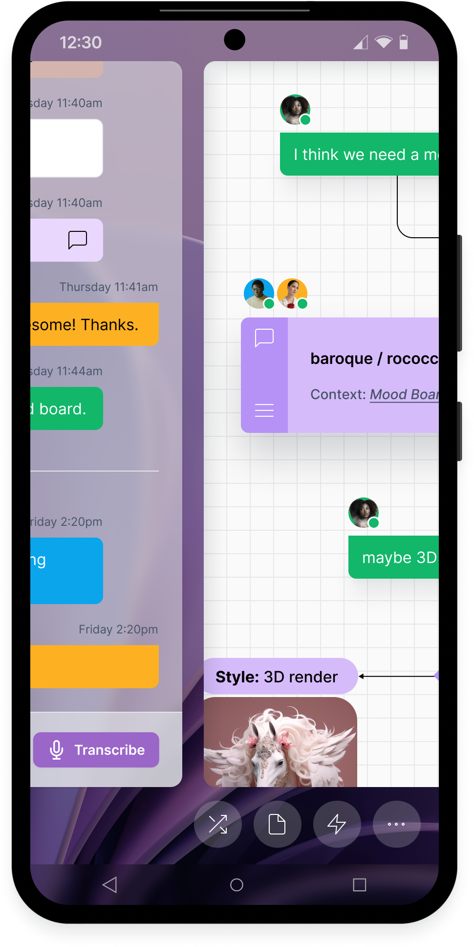 This screen shows the live transcription feature which monitors a creative work session with multiple participants and creates a mind map based on the conversation.